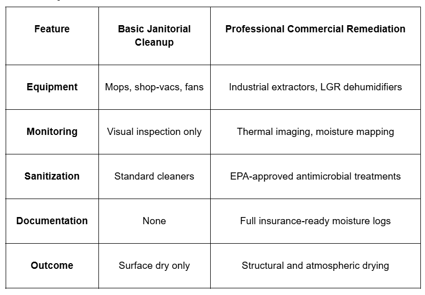 Commercial water remediation focuses specifically on the removal of pollutants and the cleaning of contaminated water to make a space habitable again. While restoration involves rebuilding physical structures like drywall or flooring, remediation is the critical sanitization and drying phase that prevents long term health hazards. In a business setting, this often involves specialized equipment to handle large square footage and high volume water extraction that standard residential tools cannot manage.